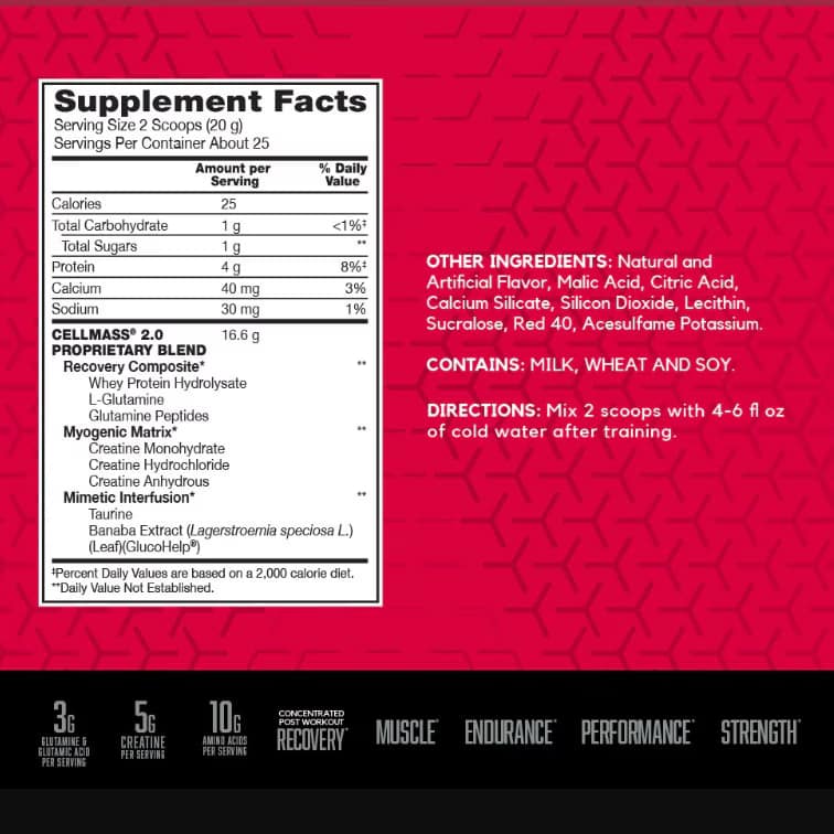 BSN Cellmass 2.0 contains a multi-pathway recovery blend: