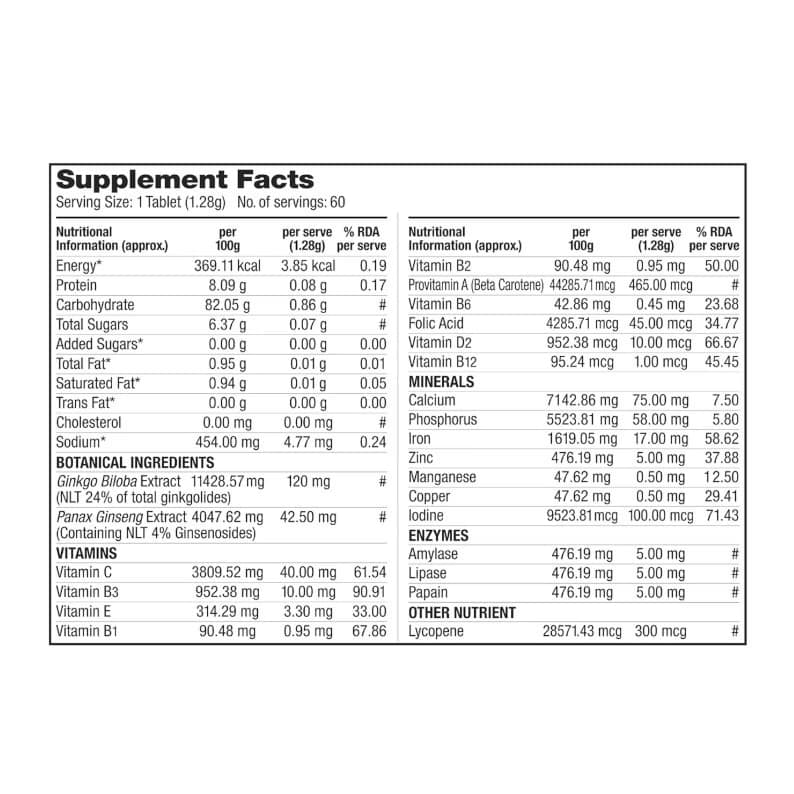 This premium multivitamin delivers a balanced blend of essential vitamins and minerals to cover the nutritional gaps in your daily diet. Each tablet contains: