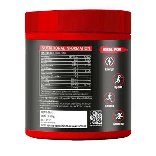 With scientifically backed ingredients like Beta-Alanine, L-Citrulline Malate, Creatine Monohydrate, Taurine, and Caffeine, this formula helps you train harder, last longer, and recover faster — so you can dominate every session with unstoppable drive.