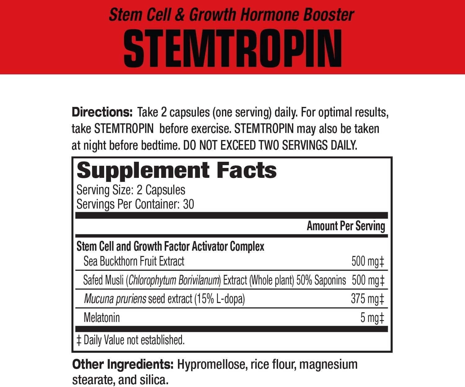 Stemtropin is powered by Mucuna Pruriens (standardized for L-Dopa), which supports the body’s natural GH production during deep sleep—helping boost muscle growth, fat metabolism, and cellular recovery.