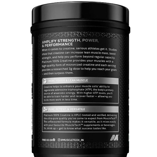 Unleash your full athletic potential with MuscleTech Platinum 100% Creatine, the purest and most advanced creatine monohydrate formula designed to enhance muscle strength, endurance, and recovery. Featuring HPLC-tested, ultra-pure micronized creatine, this supplement fuels your muscles with the essential energy they need for explosive lifts, increased power output, and lean muscle development.