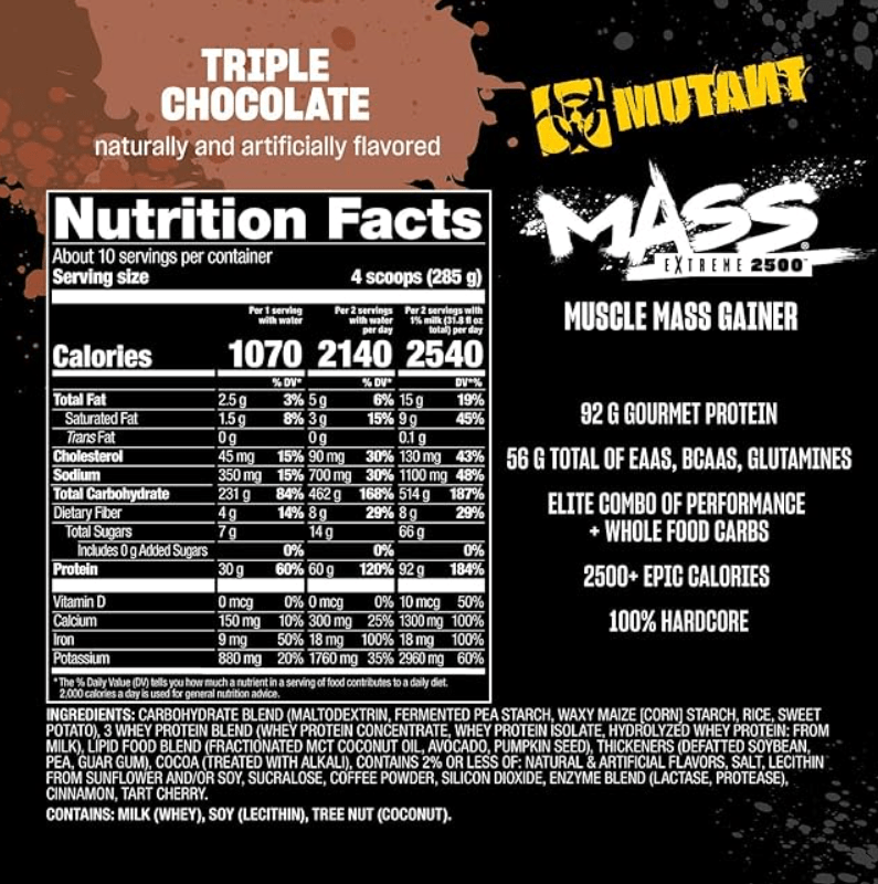 Available in mouth-watering flavors like Triple Chocolate, Vanilla Ice Cream, and Cookies & Cream, Mutant Mass Extreme 2500 mixes smoothly in water or milk for a delicious, satisfying shake.