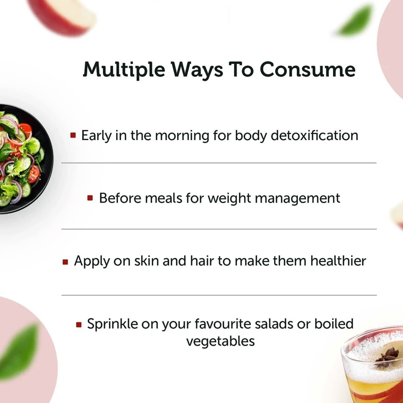 Mix 1–2 teaspoons (5–10 ml) of Neuherbs ACV in a glass of warm water. Consume on an empty stomach in the morning, or before meals to aid digestion.