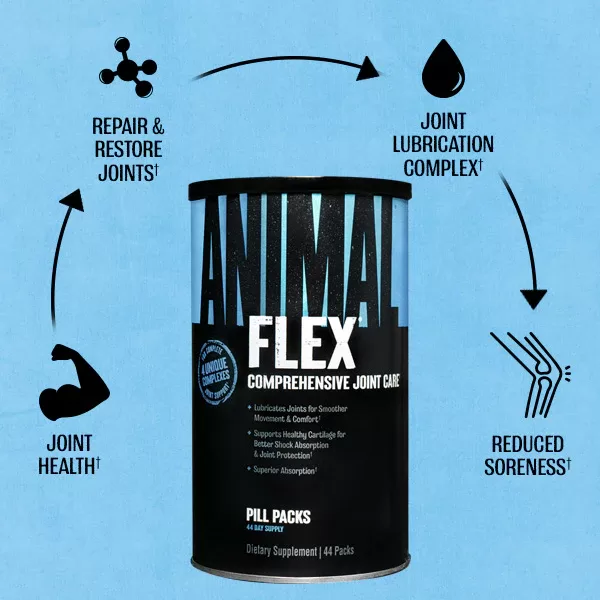 Muscles may build your physique, but joints are what keep you moving. With Universal Nutrition Animal Flex, you get complete protection and support to keep training hard without setbacks. Its unique formula works to repair, protect, lubricate, and strengthen joints, making it the ultimate joint supplement for serious athletes.